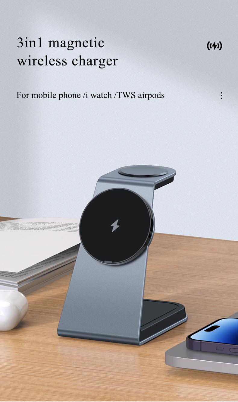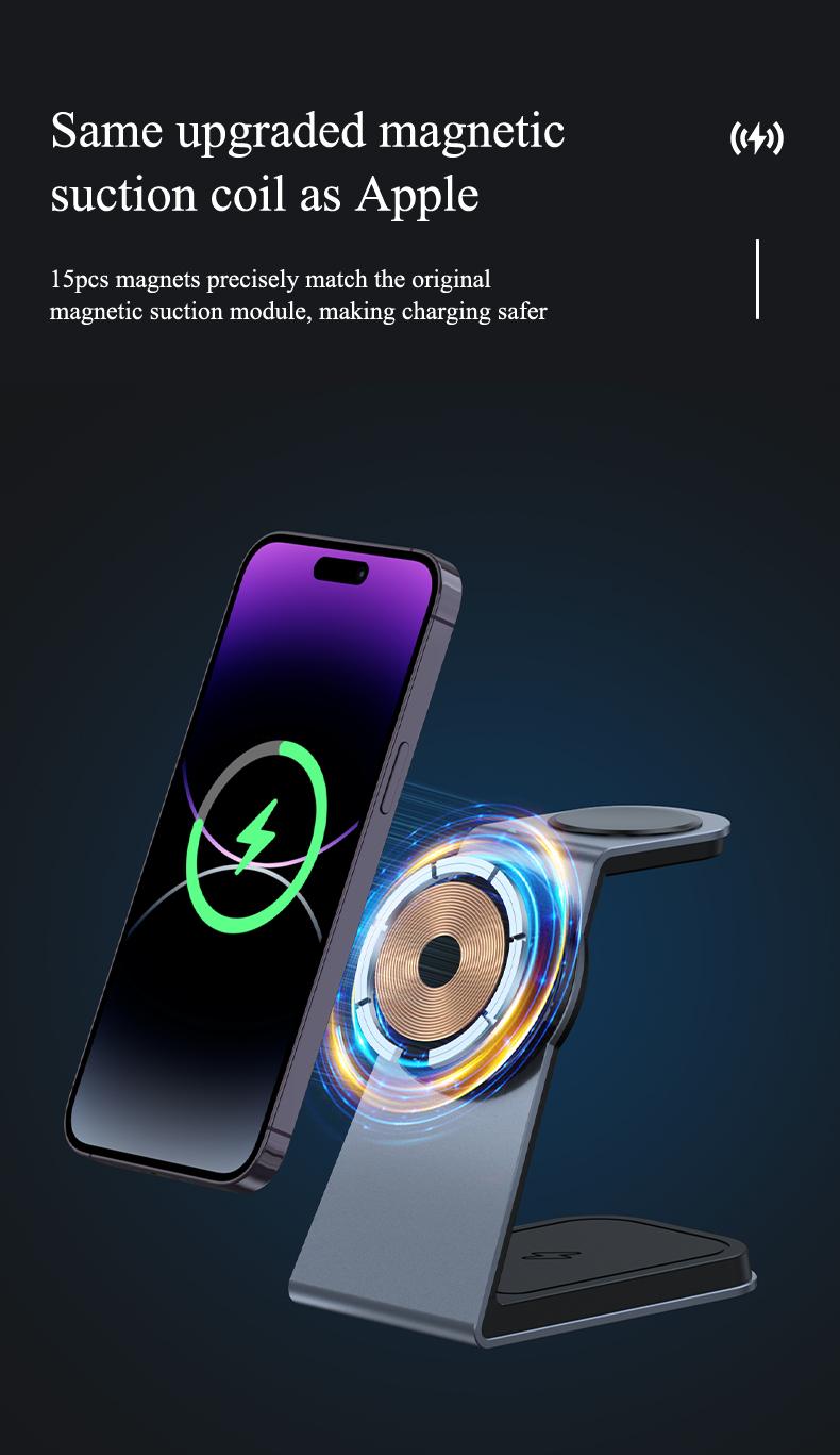【15W Magnetic Charging, 3-in-1 MagSafe Charger】Get ready to simplify your charging routine with our magsafe wireless charger! Made from full aluminum alloy which is both durable and stylish. Charge your iPhone, AirPods, and iWatch simultaneously with 15W input power, enjoy lightning-fast speeds and no more fumbling with cords. Compatible with iPhone 15/14/13/12 Series, Apple Watch Ultra/8/7/6/SE/ 5/4/3/2, AirPods 3/Pro/2. Only compatible with magsafe/magnetic phone cases.