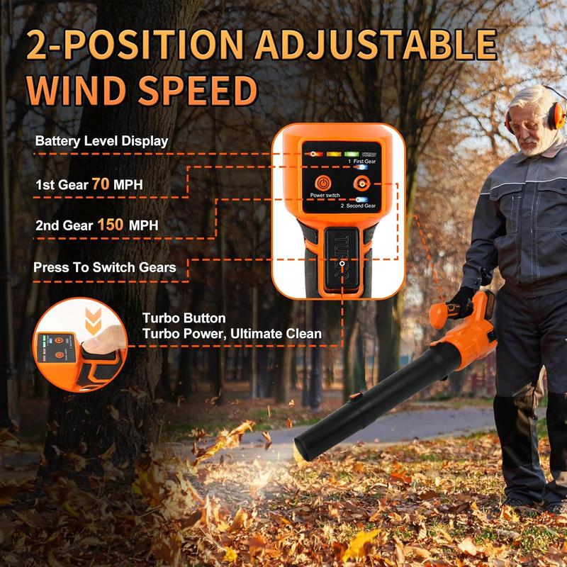 Battery blower leaf cordless has also an additional design of a speed increase button in addition to the original two speeds, which is able to increase the maximum wind speed to 180MPH, dealing well with some stubborn debris and making your cleanup more targeted and efficient.